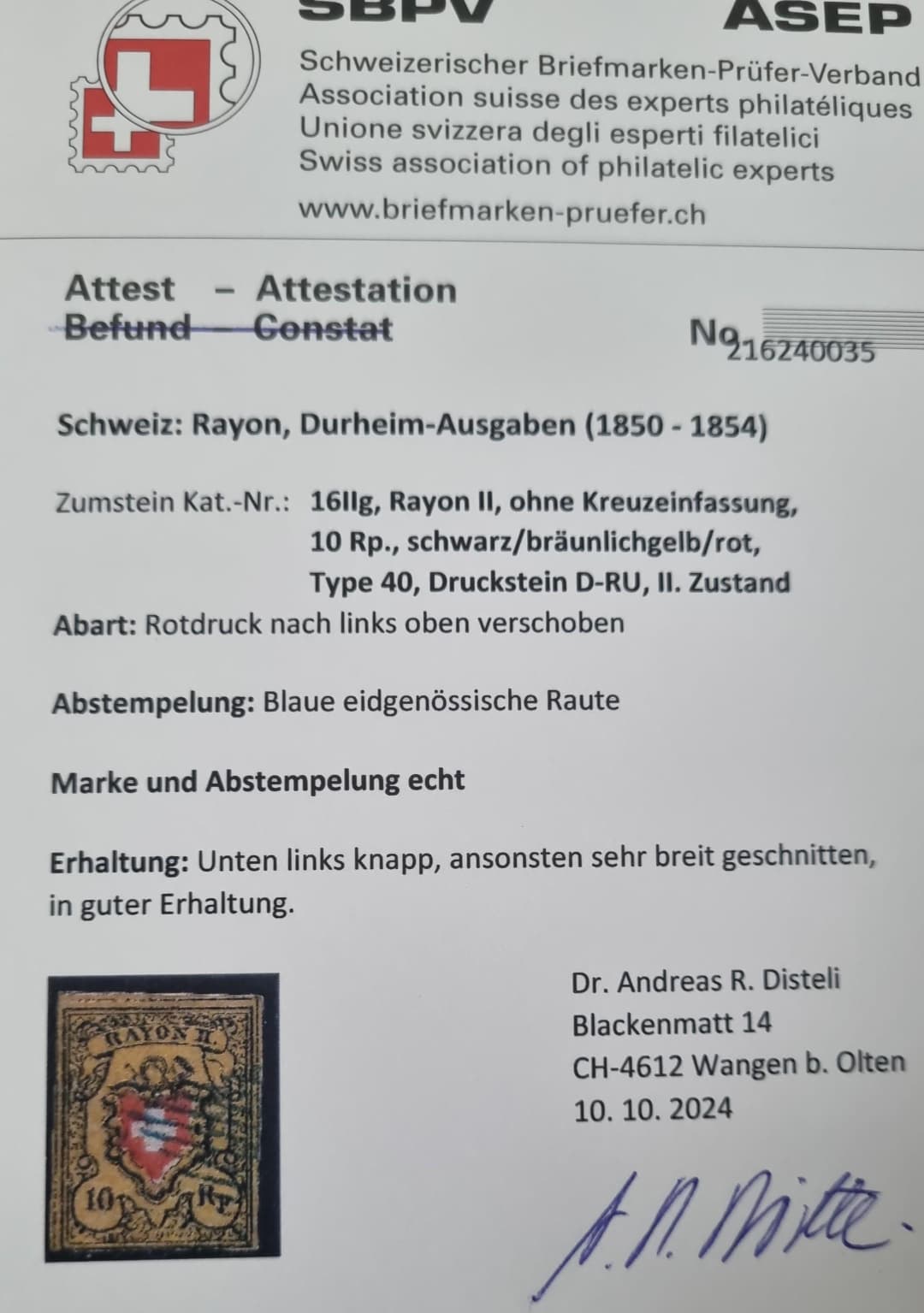 1850 Rayon 16 IIg Typ40 Druckstein D- RU mit Attest Disteli