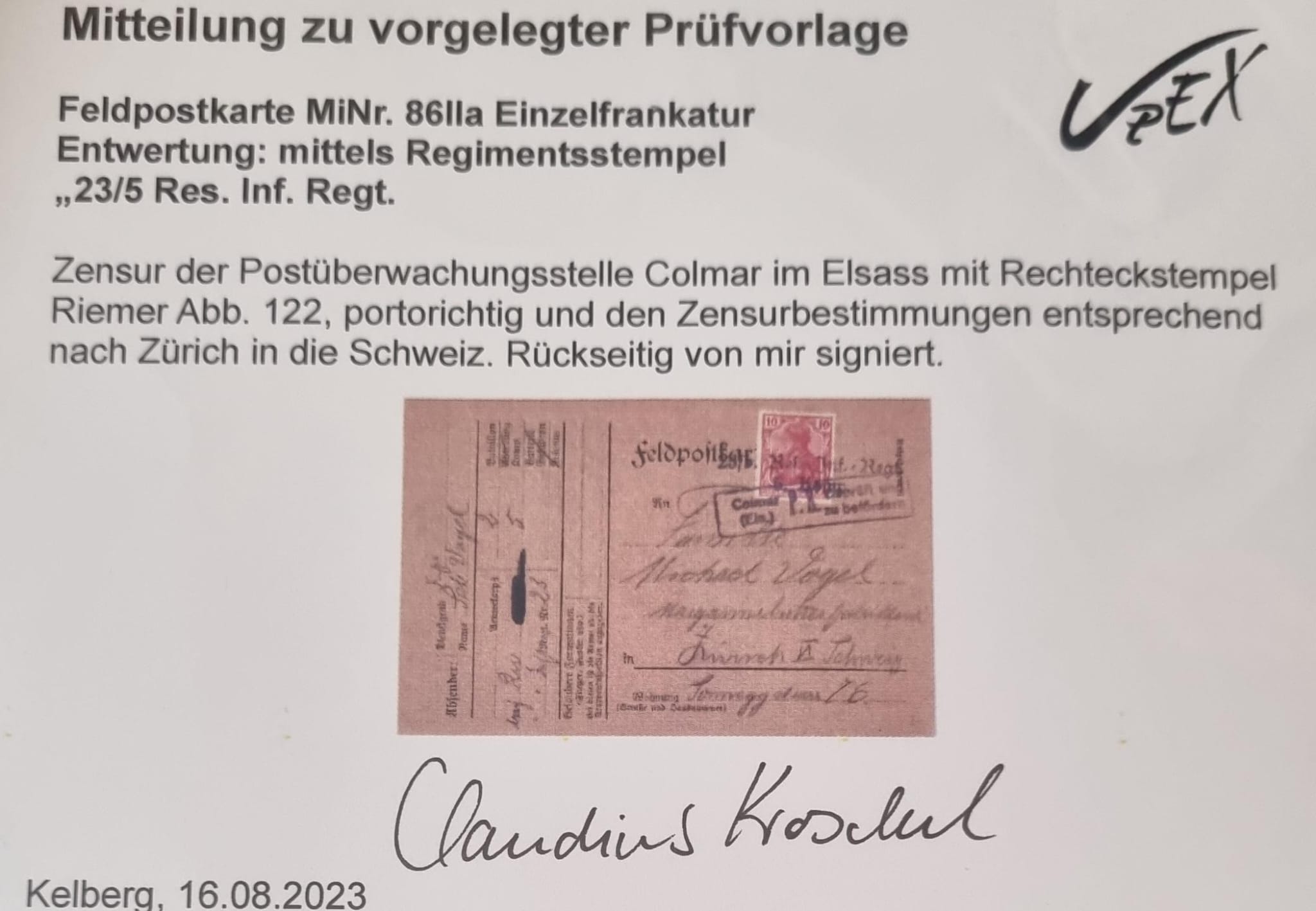 Deutsche Reich: Feldpostkarte MI Nr. 86 IIa Einzelfrankatur geprüft Kroschel