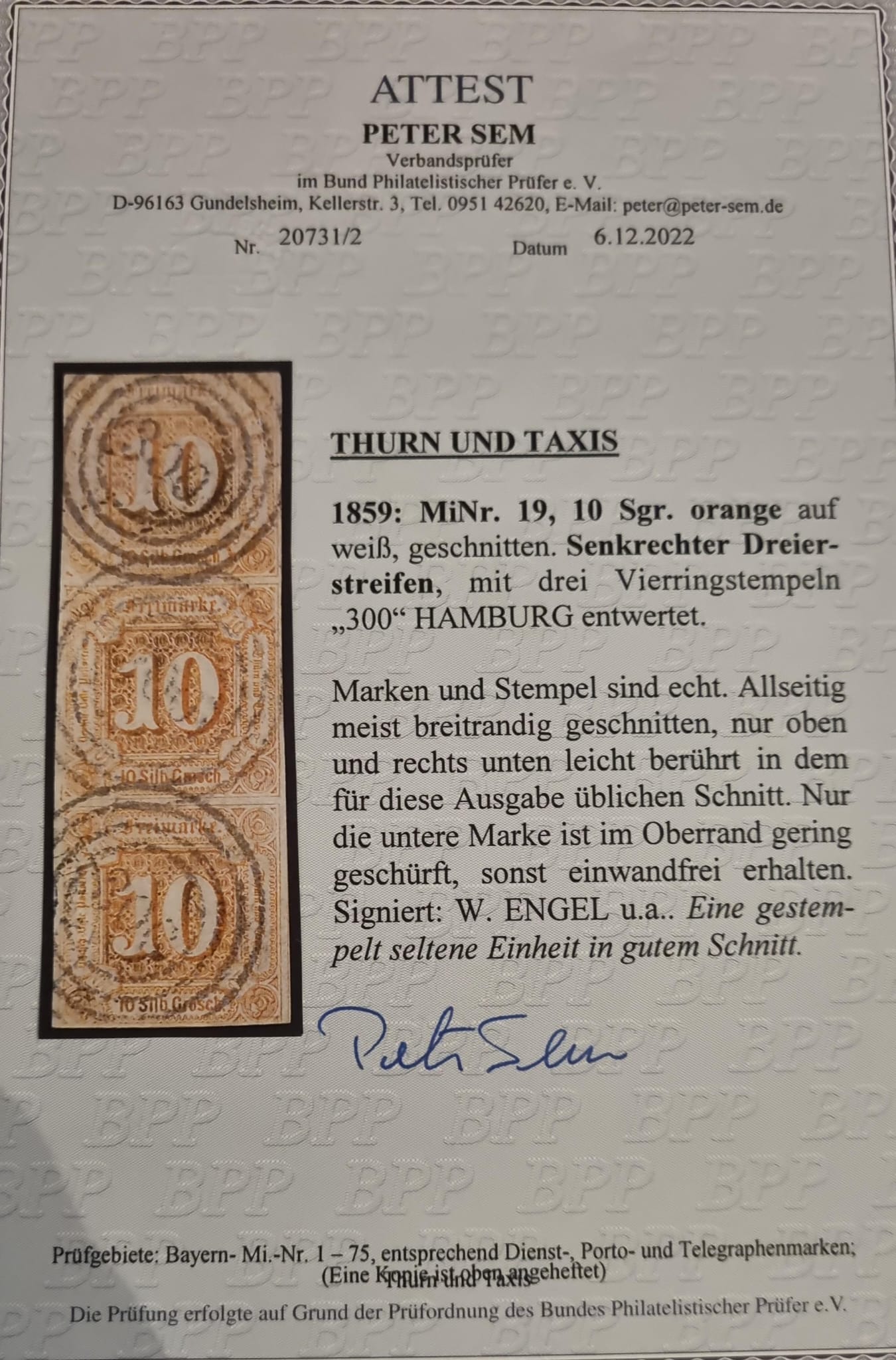 1859, Freimarken: Ziffern im Quadrat 10 Sgr. orange auf weiss geschnitten . Senkrechter Dreierstreifen, mit drei Vierringstempeln "300" Hamburg entwertet. Allseits meist breitrandig geschnitten, nur oben gering geschürft.