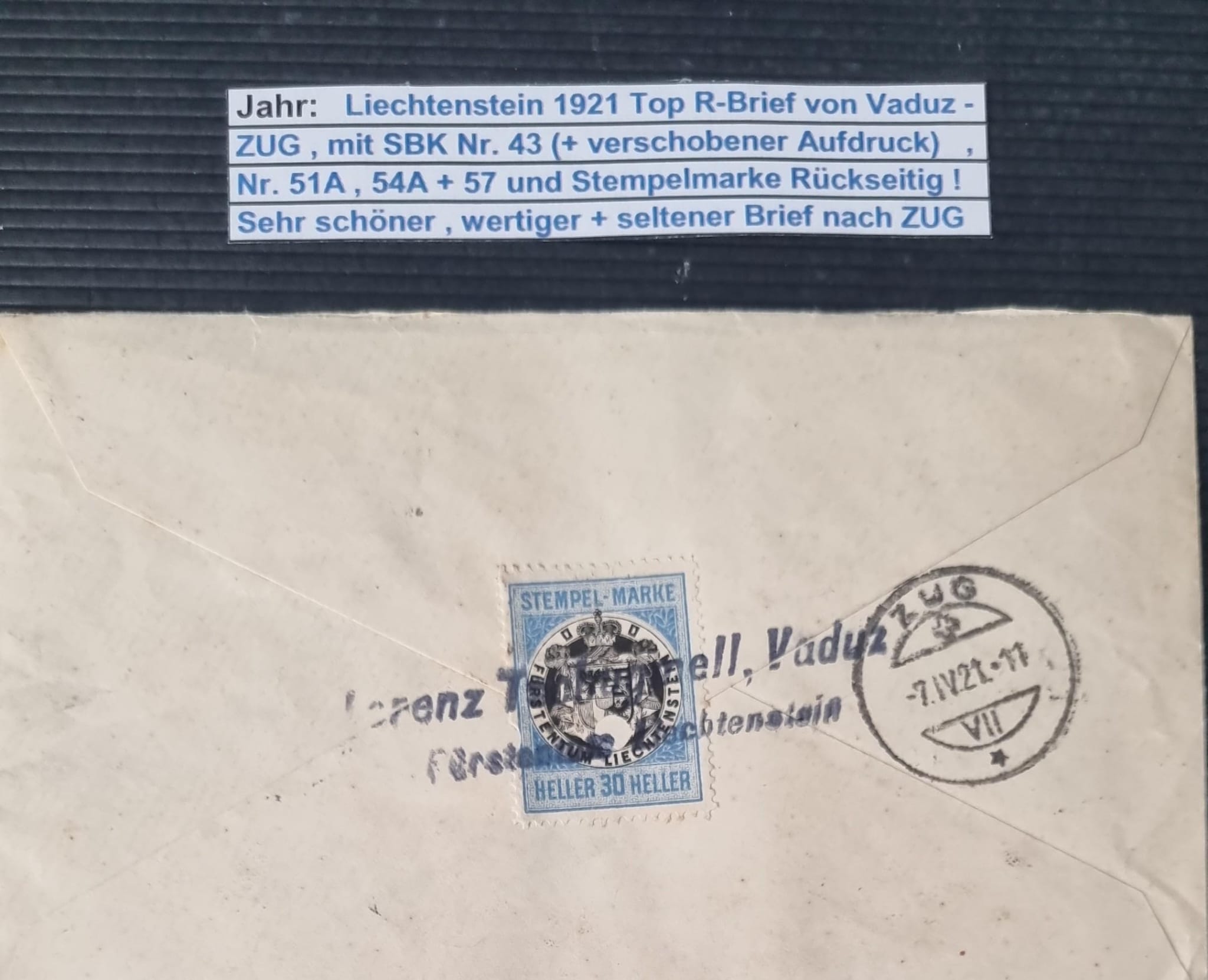 Liechtenstein: 1921 R-Brief von Vaduz nach Zug
