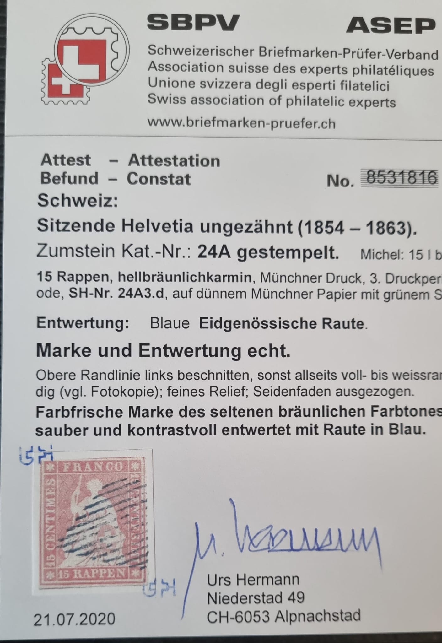 Produktinformationen "Strubel 24A (SH 24A3.d), gestempelt, eidg.,mit Attest"