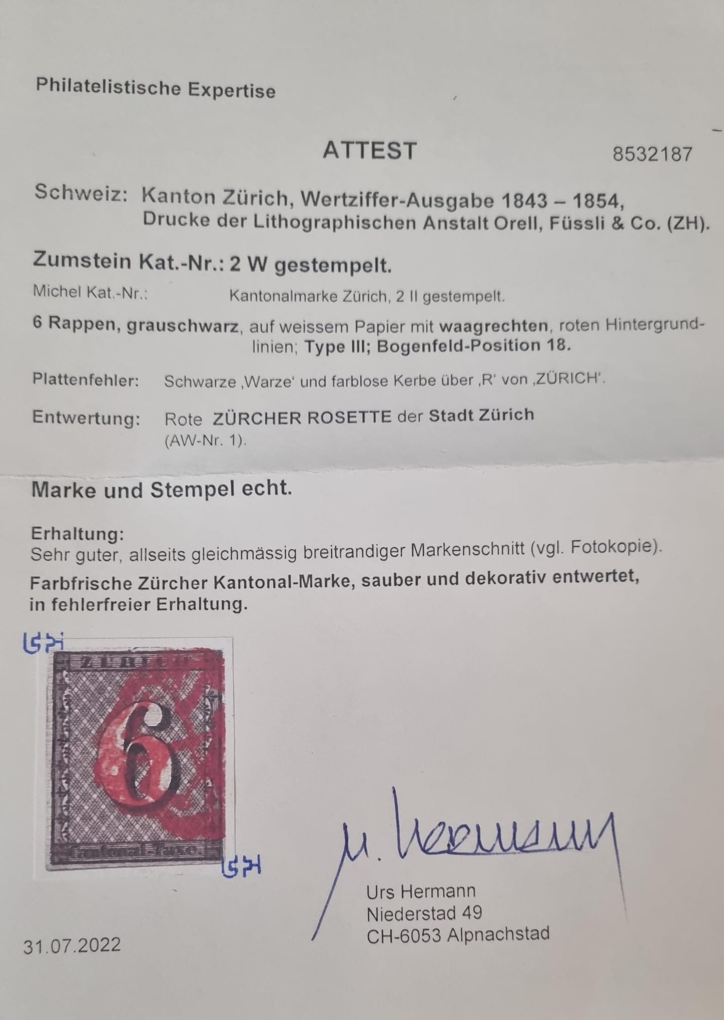 | Entwertung (gestempelt): | Rote Zürcher Rosette der Stadt Zürich |